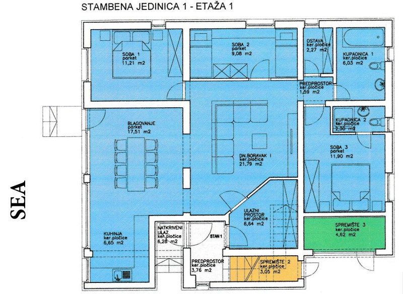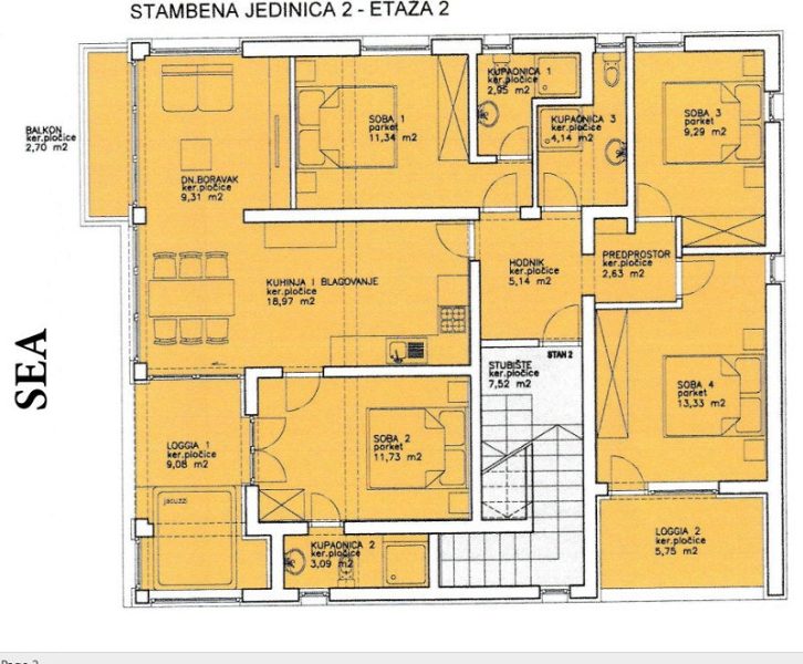 Druhé patro: Dva samostatné apartmány, jeden se dvěma ložnicemi a druhý s jednou ložnicí. Oba apartmány mají kryté terasy s úžasným výhledem na moře.
