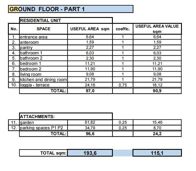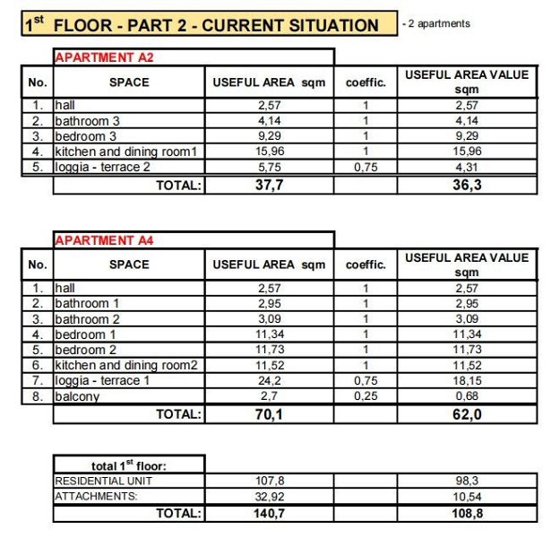 První patro: Prostorný byt se dvěma ložnicemi, kuchyní, obývacím pokojem a koupelnou. Jeden z pokojů má vlastní koupelnu. Vedle apartmánu je velká krytá terasa.