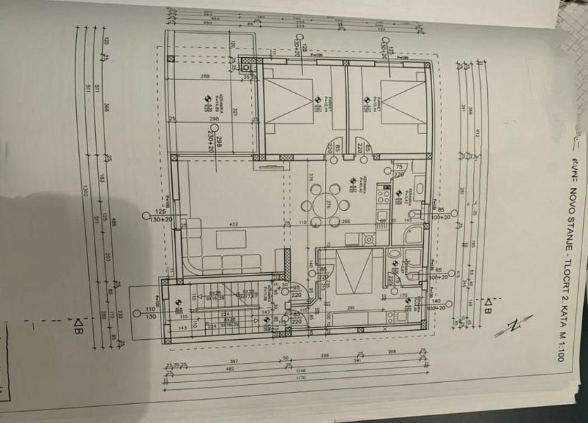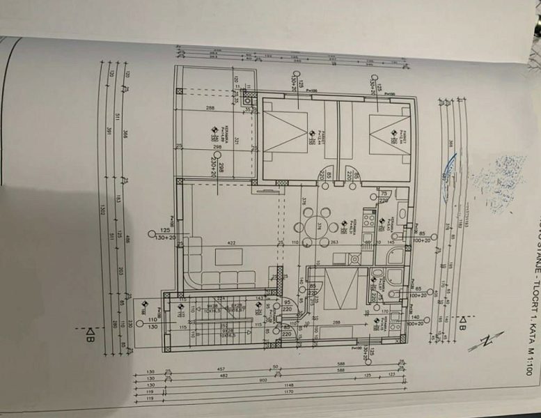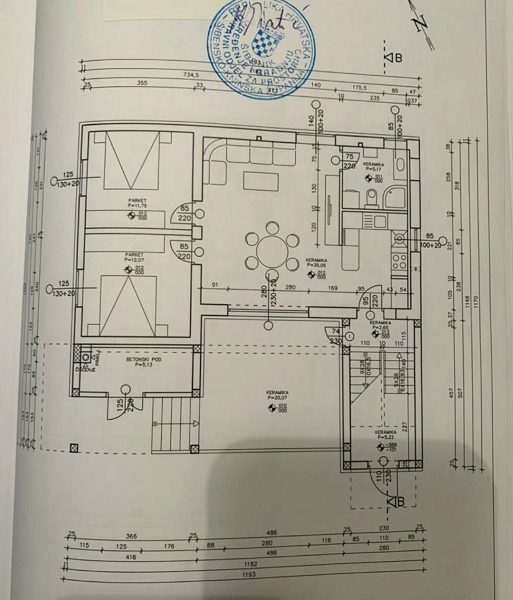 Přízemí: V přízemí se nachází prostorný apartmán se dvěma ložnicemi, moderní koupelnou, plně vybavenou kuchyní s jídelním koutem a obývacím pokojem, který vede na terasu o ploše 20 m2. Tato terasa vám umožní vychutnat si čerstvý vzduch s výhledem do upraveného dvora.