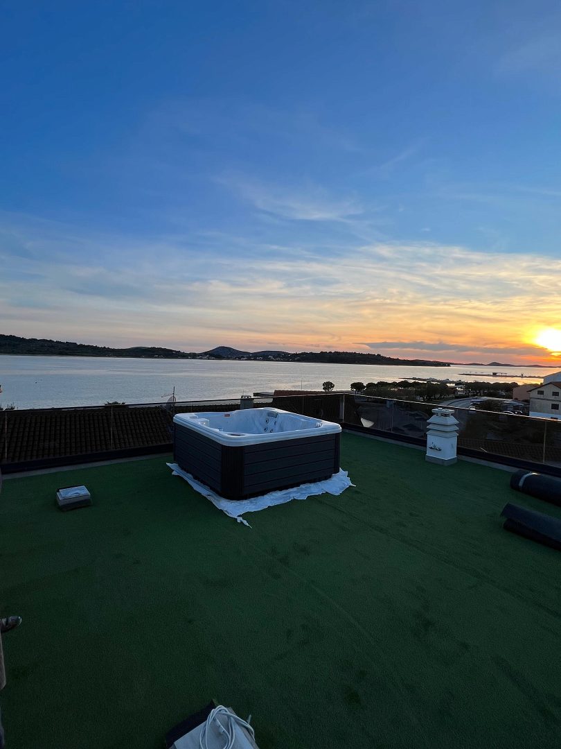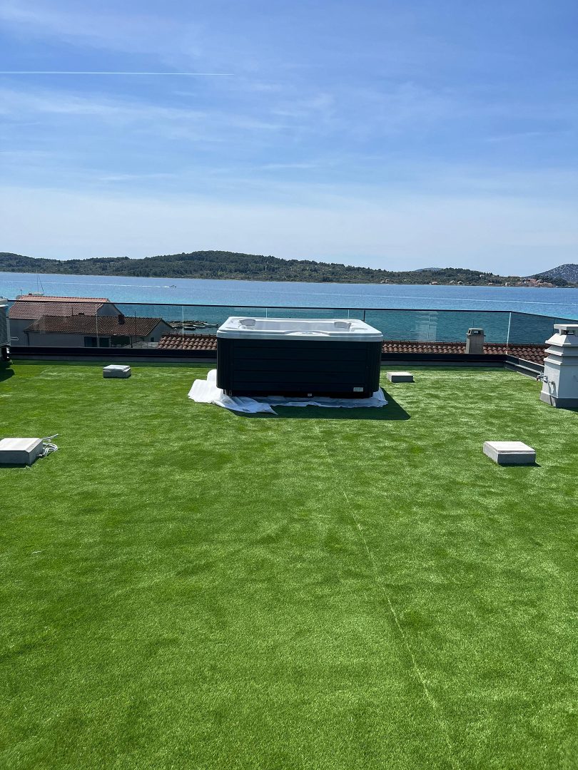 Střešní terasa: Terasa o rozloze 100 m2 nabízí nádherný výhled na moře. Na terase je umístěna vířivka, která vytváří dokonalé místo k relaxaci a vychutnání si západů slunce.