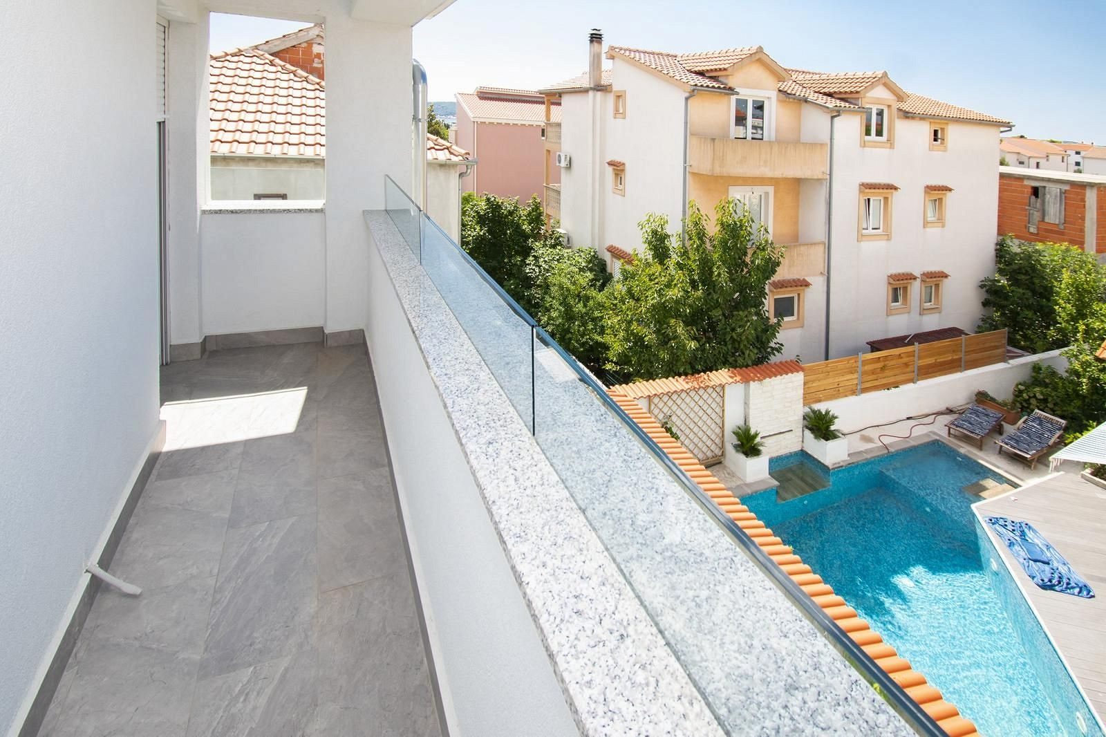 Byt se skládá ze dvou ložnic, chodby, koupelny, WC, kuchyně s jídelnou, obývacího pokoje, terasy a balkonu. Interiér bytu je kompletně vybaven všemi potřebnými spotřebiči a doplňky pro příjemný pobyt. Tento byt nabízí moderní architekturu a vysoce kvalitní provedení, s prostorným prostorem a velkými prosklenými okny, které umožňují dostatek přirozeného světla a poskytují krásný výhled na město. Budova je novější, s moderní fasádou, která kombinuje skleněné plochy, beton a přírodní materiály. S čistými liniemi a velkými okny umožňuje budova maximální množství přirozeného světla. Nachází se v klidné části města, v blízkosti pláže a centra, s atraktivním výhledem a nedaleko veškeré důležité občanské vybavenosti.