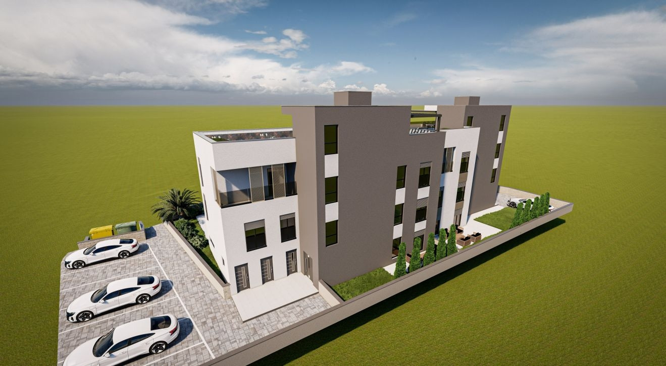 Obytný dům s nekrytými parkovacími místy, přízemí, 2 patra a střešní terasa