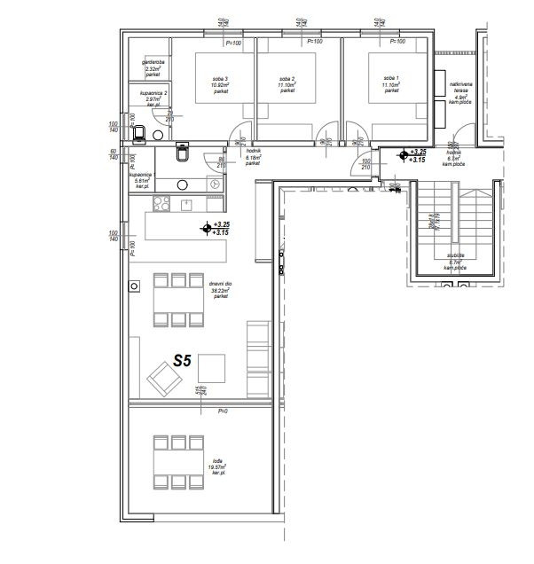 Prostorný byt 3+1 (S5) je na prodej v prvním patře novostavby v Privlace, v bezprostřední blízkosti Zadaru. Celková plocha bytu s příslušenstvím je 105,60 m². Byt se nachází v domě s 10 bytovými jednotkami, který je umístěn ve druhé řadě od moře. Vstup do objektu je soukromý, oplocený a zabezpečený přístupovým systémem s kódem nebo kartou, což majitelům zajišťuje naprosté soukromí a bezpečí.