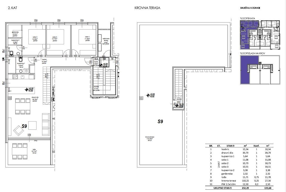 Prostorný byt 3+1 (S9) na dvou podlažích je na prodej v Privlace nedaleko Zadaru. Celková plocha bytu s příslušenstvím je 135,68 m². Byt se nachází v domě s 10 bytovými jednotkami, který se nachází ve druhé řadě od moře. Vstup do objektu je soukromý, oplocený a zabezpečený přístupovým systémem s kódem nebo kartou, což majitelům zajišťuje naprosté soukromí a bezpečí.