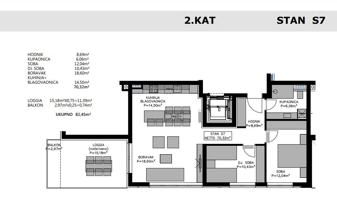 Dvě ložnice, obývací pokoj s kuchyní a jídelnou, koupelna, prostorná lodžie s výhledem na moře a apartmán je vybaven špičkovou technologií: