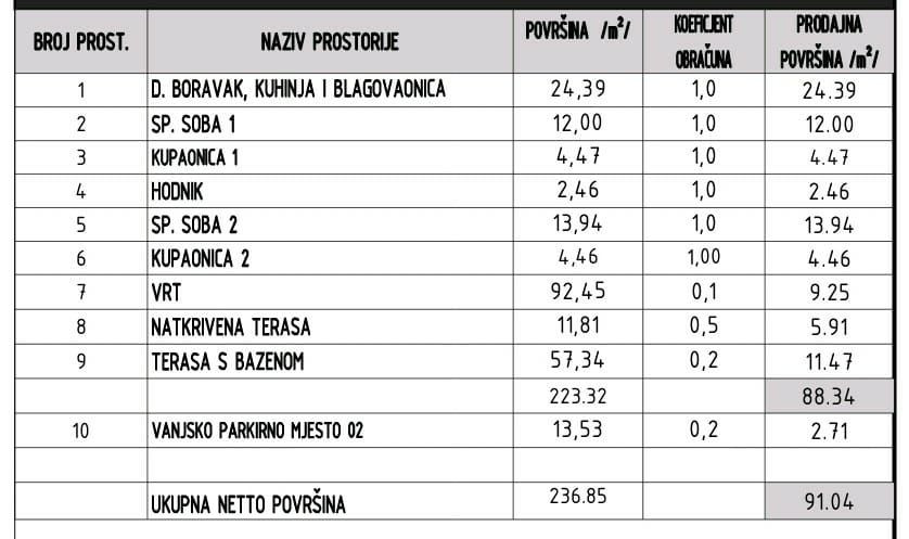 Předsíň 2,46 m2, Koupelna1 4,47 m2, Koupelna2 4,46 m2, Obývací pokoj, kuchyň. a jídelna 24,39 m2, Ložnice1 12,00 m2, Ložnice2, 13,94 m2, Krytá terasa 11,81 m2, Terasa s bazénem 57,34 m2. K bytu dále náleží zahrada 92,45 m2 a venkovní parkovací stání o velikosti 13,53 m2. Orientace bytu je jih, jihovýchod. Vypočtená čistá plocha bytu je 91,04 m2. Plánované dokončení všech prací je začátek roku 2026.