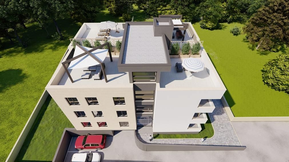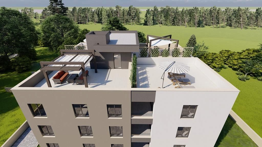 Tento elegantní byt s čistou plochou 93,85 m² je dokonale vyprojektovaný pro pohodlné bydlení. Skládá se z obývacího pokoje, kuchyně, koupelny a jedné prostorné ložnice, která poskytuje klid a pohodlí. Zvláštní požitek poskytuje uzavřená lodžie pro relaxaci ve všech ročních obdobích, stejně jako soukromá střešní terasa 70 m², ideální pro venkovní posezení s krásným výhledem do okolí. K bytu náleží další úložný prostor, jedno garážové stání a jedno venkovní stání, které poskytují pohodlí a zvýšenou bezpečnost pro vaše vozidla.
