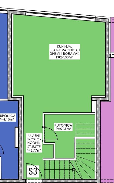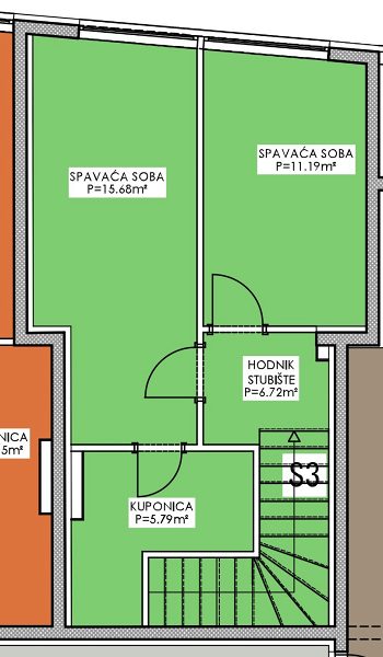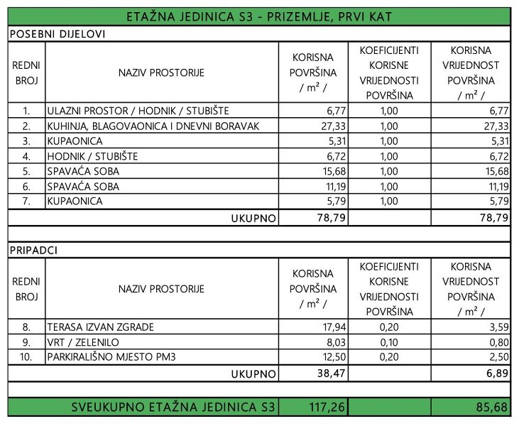 Prostorný dvoupodlažní byt s označením S3 se nachází v přízemí a v prvním patře budovy a má rozlohu 85,68 m2, sestává z přízemí s otevřeným obývacím pokojem, s koupelnou a vstupem na zahradu o velikosti 8 m2, a v prvním patře jsou dvě prostorné ložnice a koupelna. K bytu náleží dvě parkovací stání ve dvoře domu.