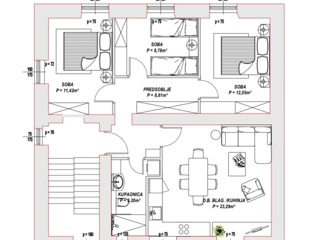 - První byt se nachází ve 2. patře, má 70 m² a tvoří jej kuchyně, jídelna a obývací pokoj, tři prostorné ložnice, koupelna, vstupní část a chodba.