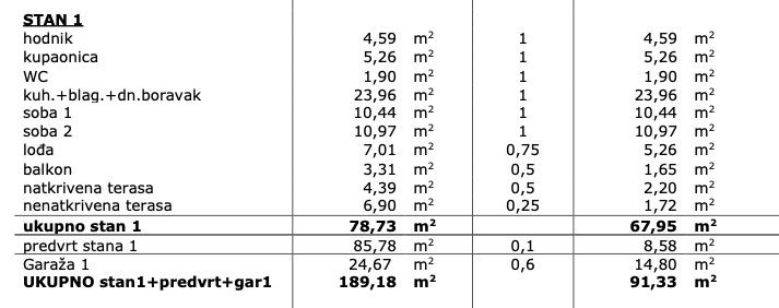 Dva dvoupokojové byty s přilehlými zahradami - **1. Patro:** Dva apartmány s vlastními střešními terasami a nádherným výhledem na moře a Velebit Apartmán S1, 91 m2, sestává z koupelny, WC, dvou ložnic, obývacího pokoje s kuchyní a jídelnou, se vstupem na krytou i nekrytou terasu, která je v komunikaci s velkou prostornou zahradou 85 m2. K bytu náleží velká, prostorná garáž v suterénu domu, plocha garáže je 24,67 m2. Popis vybavení: - 10 cm izolace z minerální vlny - parkety a prvotřídní keramika - Vytápění a chlazení přes multi split systém - klimatizace ve všech místnostech - el. rolety -podlahové vytápění v koupelnách -bezpečnostní dveře **Termín dokončení:** Léto 2025.