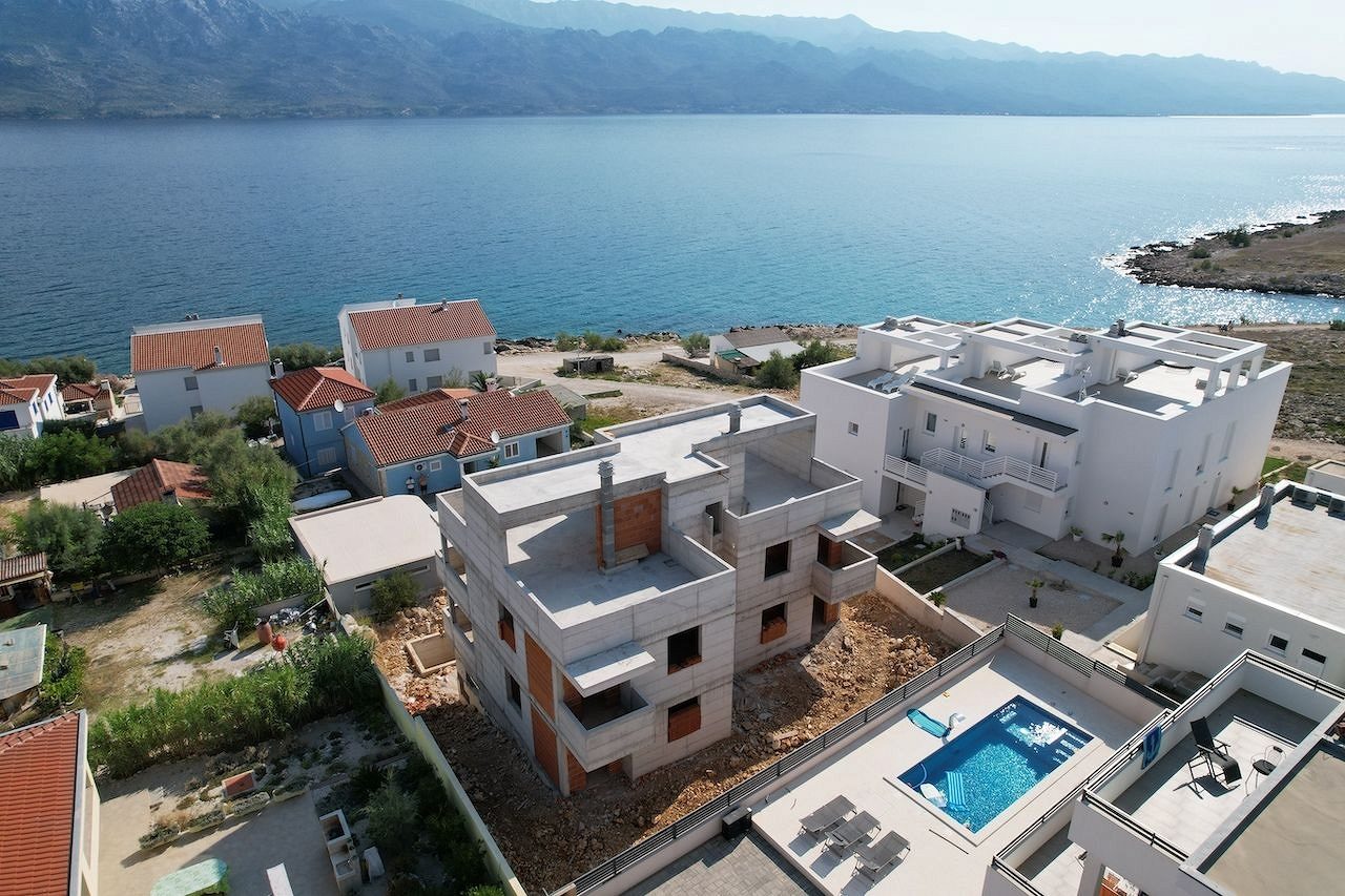 Nabízíme k prodeji luxusní apartmány v rezidenčním domě, který se nachází pouhých 50 metrů od moře, s krásným panoramatickým výhledem na moře Velebit a pohoří Velebit. Budova se skládá ze 4 bytů: - **Suterén:** Prostorné garáže - **Přízemí:** Dva dvoupokojové byty s přilehlými zahradami - **1. Patro:** Dva apartmány s vlastními střešními terasami a nádherným výhledem na moře a Velebit Apartmán S3 Penthouse - 103,53 m2, sestává ze dvou balkonů, koupelny, WC, dvou ložnic, obývacího pokoje s kuchyní a jídelnou. K bytu náleží velká, prostorná garáž v suterénu domu, plocha garáže je 24,21 m2 a velká střešní terasa 68 m2, která nabízí nádherný výhled na moře a hory. Popis vybavení: - 10 cm izolace z minerální vlny - parkety a prvotřídní keramika - Vytápění a chlazení přes multi split systém - klimatizace ve všech místnostech - el. rolety -podlahové vytápění v koupelnách -bezpečnostní dveře **Termín dokončení:** Léto 2025. Jedinečná příležitost investovat do nemovitosti v atraktivní lokalitě, která nabízí dokonalé spojení komfortu a přírodních krás.