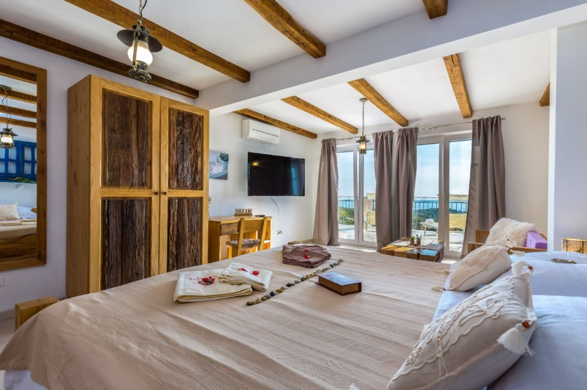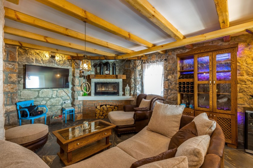 V přízemí se nachází prostorná obývací kuchyně, ze které se vchází na prostornou krytou terasu s výhledem na bazén a moře. Z kuchyně se vchází do velkého obývacího pokoje, který zdobí kamen, dřevěné trámy a krásný krb. K přízemí patří spižírna, šatna, koupelna se sprchovým koutem a sauna.