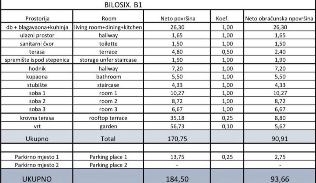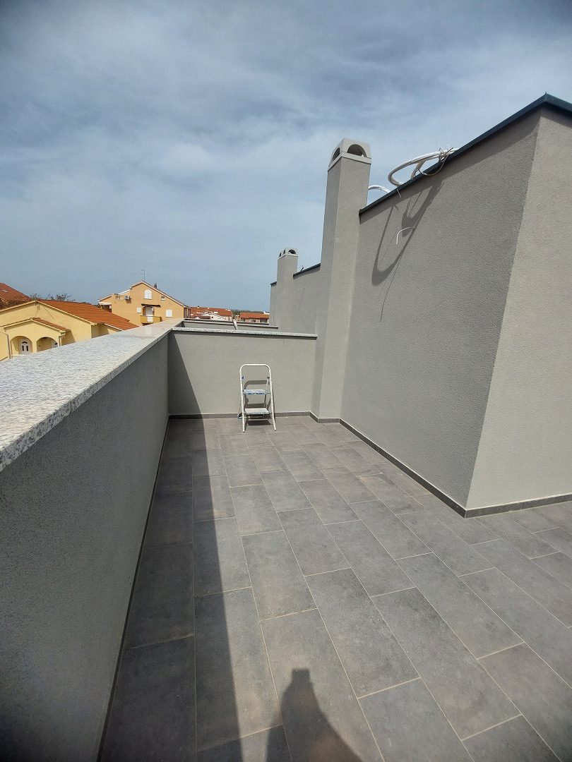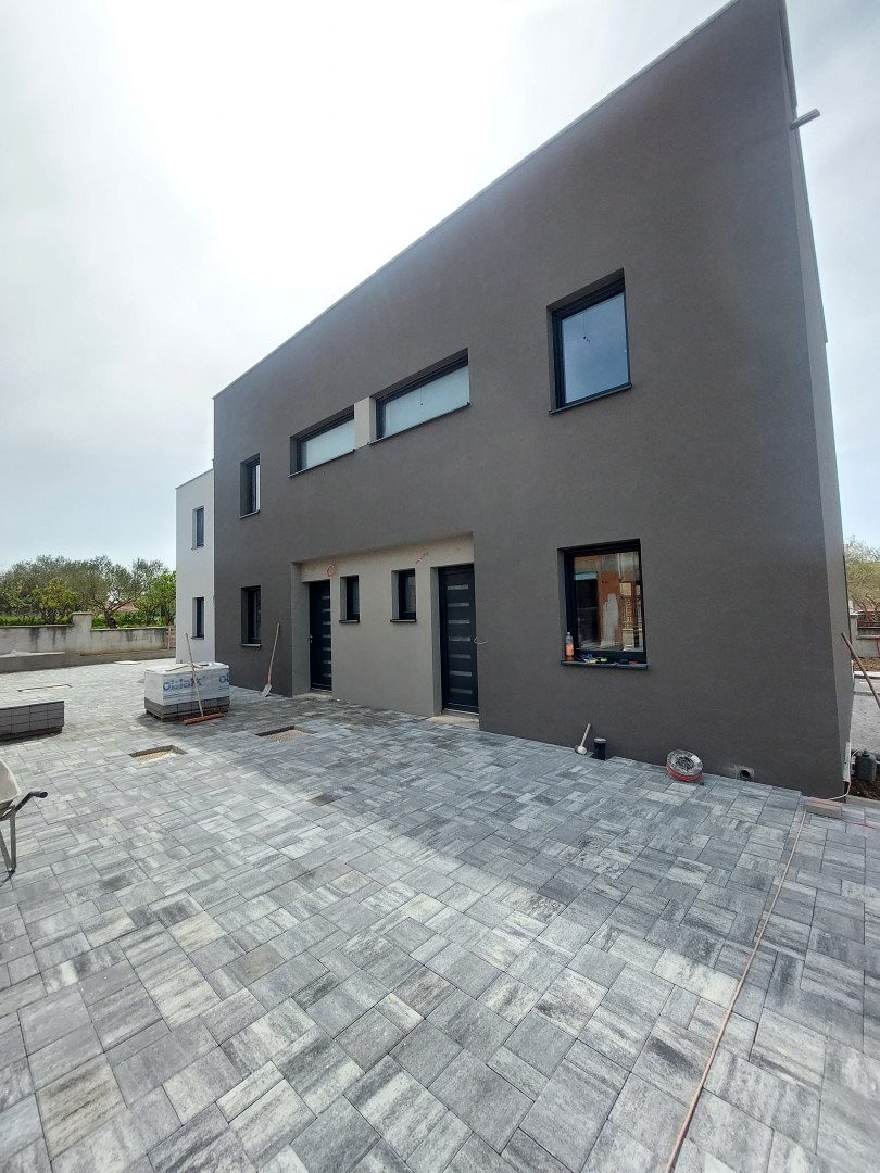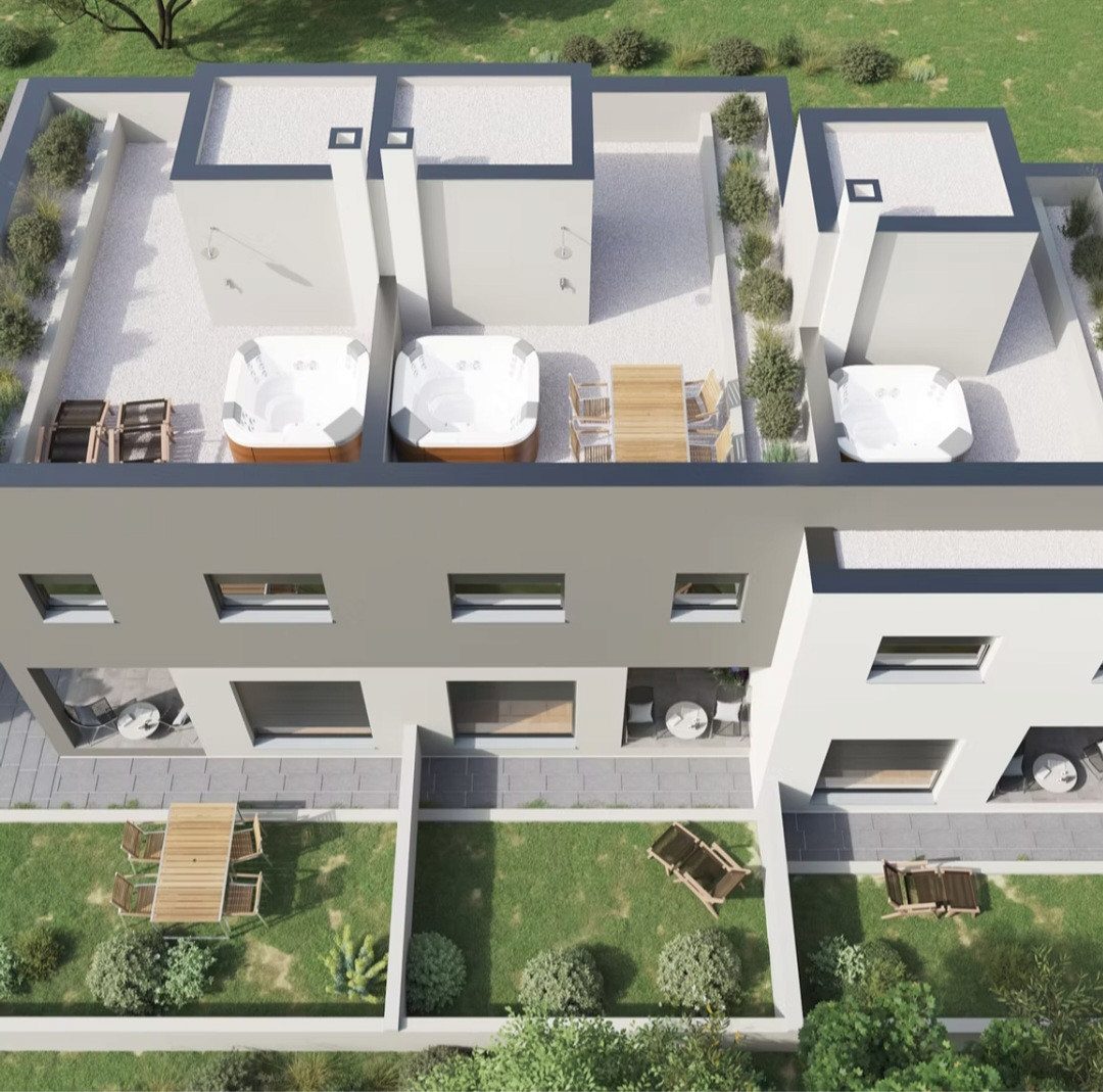 Na prodej moderní dvoupodlažní dům v malém komplexu tří domů, kombinující pohodlí rodinného domu a funkčnost bytu s vlastním dvorem a střešní terasou s výhledem na moře.