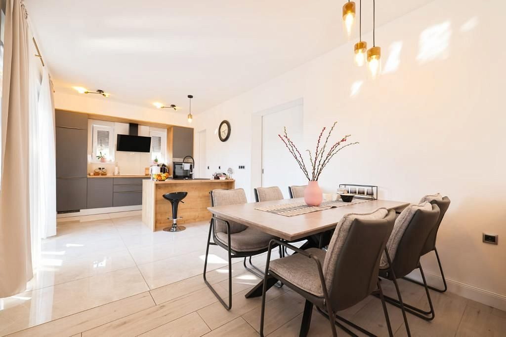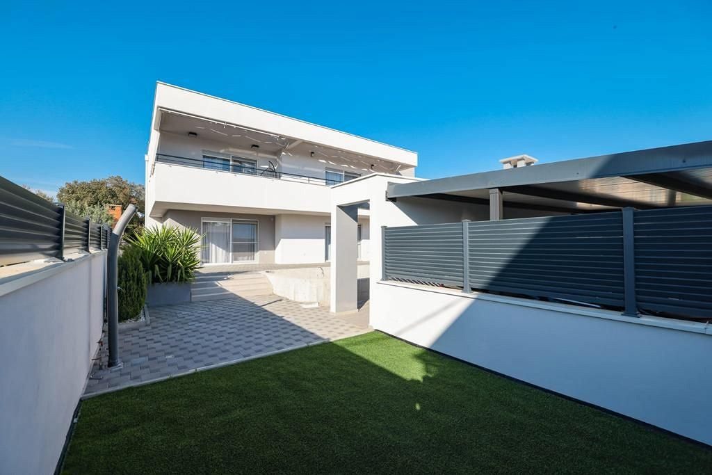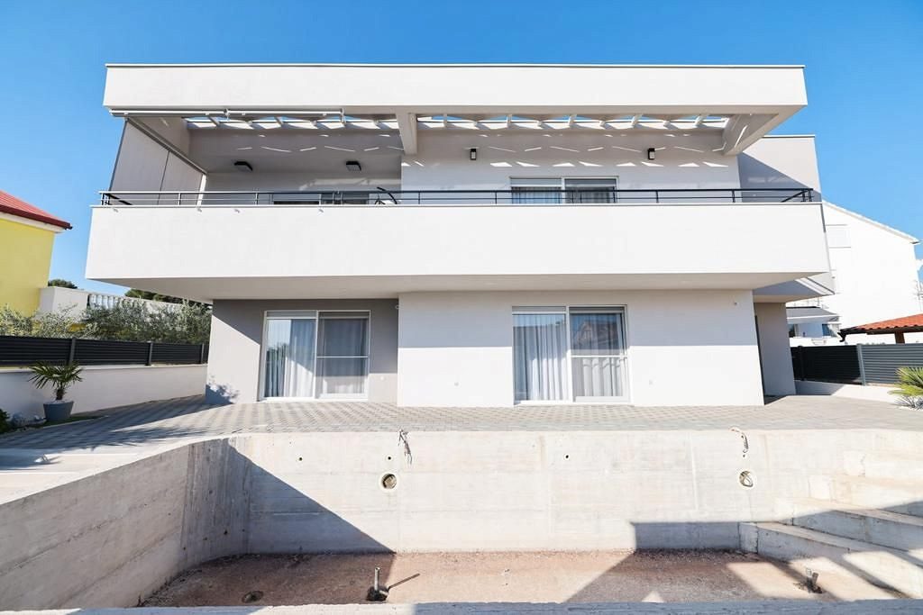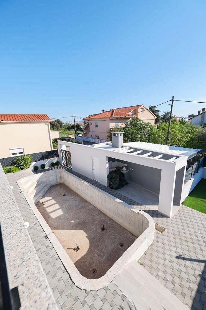 Na prodej je krásný, moderní, luxusní dům s bazénem, který se nachází v Bibinje nedaleko Zadaru. Dům má dvě podlaží, s celkovou obytnou plochou 290 m2. Dům je postaven na pozemku o velikosti 468 m2. pevná konstrukce, termoblok a pokrytý 8 cm izolací z polystyrenu, dále plochá střecha, která je kromě zateplení polystyrenem pokryta kamennými oblázky. V přízemí je jeden byt 1+1 45 m2 a jeden byt 2+1 58 m2. V prvním patře je byt 3+1 135 m2 a terasa 33 m2. Ve dvoře luxusního domu se nachází bazén 8x3 m a letní kuchyně. Tento luxusní dům se prodává kompletně zařízený a je vhodný k bydlení nebo jako investice.