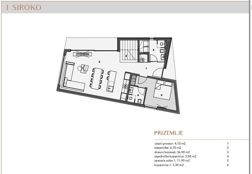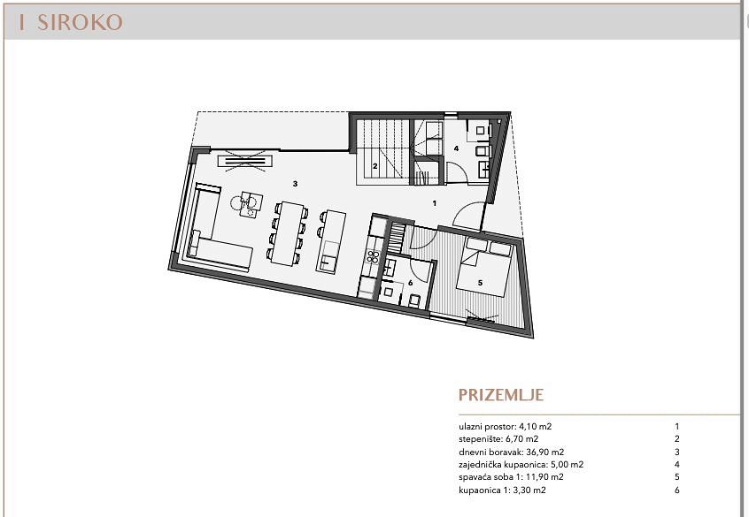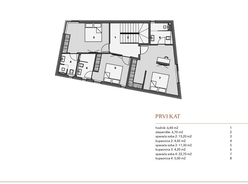 OSTROV MURTER, VĚTRNÁ RŮŽOVÁ JEZERA je nový uzavřený rezidenční komplex sestávající ze 7 rodinných domů a 1 bytového domu se 2 byty. Nachází se v jižní části obce Jezera na ostrově Murter, 45 metrů od moře (marina) a 300 metrů od dobře udržované pláže. Osada je introvertní, respektive orientovaná do vlastního vnitrozemí, aby byl zajištěn klid a intimita, ale inspirativní výhled na moře a ostrovy je nedílnou součástí každé obytné jednotky. K domům se vstupuje přes vlastní uliční náměstí, které formou a materiály připomíná tradiční urbanismus ulic a náměstí při respektování přirozené konfigurace terénu a kolem centrálního náměstí jsou domy rozmístěny v 8 směrech, inspirované růžicí kompasu, podle níž jsou domy pojmenovány. Vnitřní ulice, stejně jako vnější veřejné ulice, jsou nerovnoměrné ve vztahu k pozemkům v osadě, takže každý pozemek je vždy vyšší než silnice, kterou ohraničuje. Na křivku ulice navazují opěrné zdi, které dominují terénu a funkčně oddělují společné od soukromého. Ke každému domu náleží parkovací stání, vlastní bazén a upravená zahrada, umístění domů na pozemcích zajišťuje soukromí před pohledy sousedů, venkovní část ve stínu a prostor na opalování. Každý dům má zařízenou střešní terasu, která nabízí nejpůsobivější výhledy do okolí. Domy jsou navrženy podle vyšších standardů výstavby a bydlení. Každý dům je vybaven tepelným čerpadlem, které vytápí a chladí dům a každá místnost je vytápěna a chlazena, kromě skladu. Všechny koupelny a kuchyně jsou vybaveny elektrickým podlahovým vytápěním. Prosklené stěny a okna jsou vyrobeny z vysoce kvalitních hliníkových profilů s nízkými faktory tepelné a zvukové vodivosti. Všechny otvory a zasklení jsou vybaveny ovladatelnou protisluneční ochranou. Vytápění a chlazení, ochranu proti slunci a video dohled lze ovládat pomocí chytrého telefonu ze vzdáleného místa. Každá bytová jednotka bude plně vybavena nábytkem, který bude viditelný v následně vytvořeném designu interiéru. Vybavení koupelen, instalační technika, podlahové a stěnové krytiny jsou produkty renomovaných světových výrobců. Venkovní areál zdobí oplocení, místní rostliny nebo kamenné oblázky a venkovní bazén je vyhřívaný. Siroko je první dům v osadě Wind Rose a nachází se v jihovýchodní části. Pozemek je přístupný ze severu a na jihozápadní straně hraničí s veřejnou ulicí, ze které je vyvýšen a do které je uzavřen z důvodu zachování soukromí. Dům má 4 ložnice a 5 koupelen, jedna ložnice se nachází v přízemí a je bezbariérová nebo lze využít jako kancelář/posilovnu. Promyšleným půdorysem a centrálně umístěným schodištěm či komunikací bylo dosaženo vysoké půdorysné efektivity při zachování funkčnosti. Na rodinný pokoj navazuje krytá terasa a zahrada, kde je i bazén. Je orientován do nitra osady, tedy do centrální ulice, aby byl zajištěn klid a soukromí, a ze zahrady je výhled do městské ulice, případně na vnitřní náměstí osady, ze kterého je dům rovněž vyvýšen. Na střeše je panoramatická terasa s nerušeným výhledem na moře, přístav a ostrov a střešní dům je umístěn tak, aby omezoval výhledy ze sousedních střešních teras. Protisluneční ochranu zajišťuje tvar domu, konkrétně konzolový výstupek, pevné lamely, které jsou vedle tradičního kamene rozpoznatelným motivem sídliště, a elektricky pohyblivé žaluzie. Na pozemku je parkoviště pro dvě vozidla. PŘÍZEMÍ vstupní plocha: 4,10 m2 schodiště: 6,70 m2 obývací pokoj: 36,90 m2 společná koupelna: 5,00 m2 ložnice 1: 11,90 m2 koupelna 1: 3,30 m2 PRVNÍ PATRO chodba: 6,40 m2 1 ložnice: 2 m2 schodiště. 4,05 m2 ložnice 3: 11,30 m2 koupelna 3: 4,20 m2 ložnice 4: 22,70 m2 koupelna 4: 5,00 m2 STŘEŠNÍ TERASA střešní dům: 8,40 m2 střešní terasa: 57,00 m2 Pro jakékoli další informace o této luxusní nemovitosti nás prosím kontaktujte.