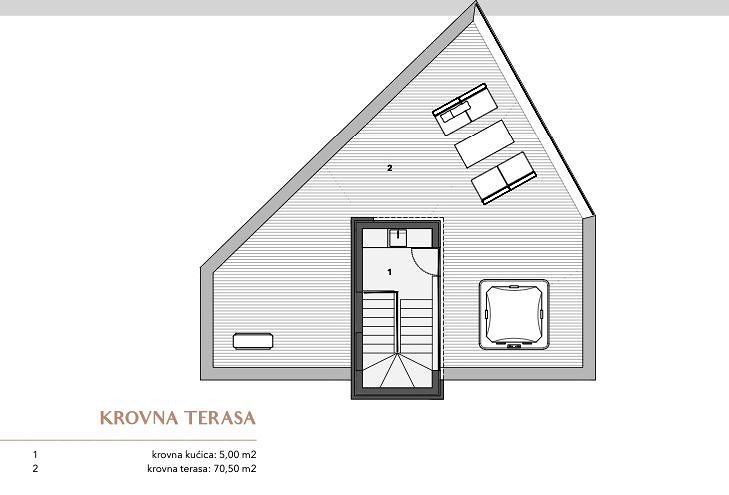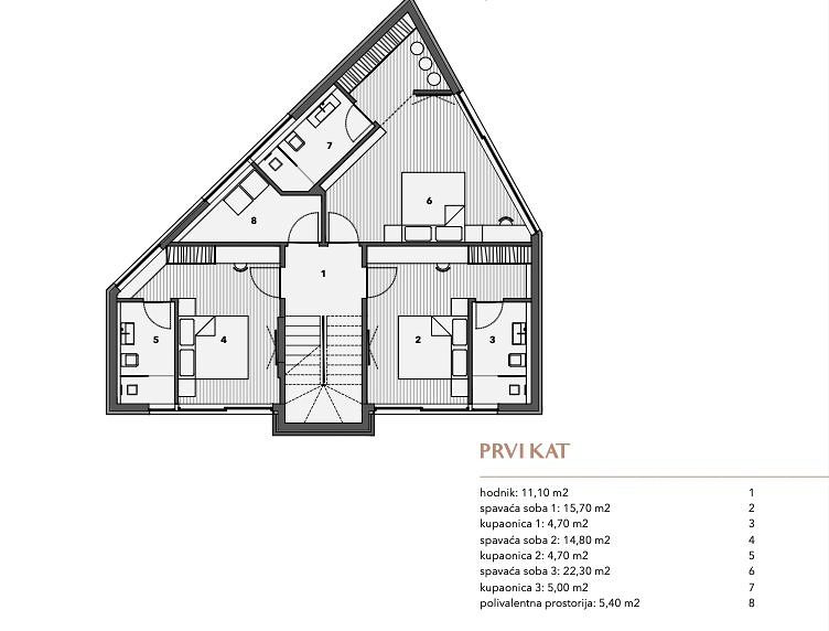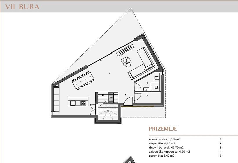 OSTROV MURTER, VĚTRNÁ RŮŽOVÁ JEZERA je nový uzavřený rezidenční komplex sestávající ze 7 rodinných domů a 1 bytového domu se 2 byty. Nachází se v jižní části obce Jezera na ostrově Murter, 45 metrů od moře (marina) a 300 metrů od dobře udržované pláže. Osada je introvertní, respektive orientovaná do vlastního vnitrozemí, aby byl zajištěn klid a intimita, ale inspirativní výhled na moře a ostrovy je nedílnou součástí každé obytné jednotky. K domům se vstupuje přes vlastní uliční náměstí, které formou a materiály připomíná tradiční urbanismus ulic a náměstí při respektování přirozené konfigurace terénu a kolem centrálního náměstí jsou domy rozmístěny v 8 směrech, inspirované růžicí kompasu, podle níž jsou domy pojmenovány. Vnitřní ulice, stejně jako vnější veřejné ulice, jsou nerovnoměrné ve vztahu k pozemkům v osadě, takže každý pozemek je vždy vyšší než silnice, kterou ohraničuje. Na křivku ulice navazují opěrné zdi, které dominují terénu a funkčně oddělují společné od soukromého. Ke každému domu náleží parkovací stání, vlastní bazén a upravená zahrada, umístění domů na pozemcích zajišťuje soukromí před sousedy, zastíněné venkovní prostranství a prostor na opalování. Každý dům má zařízenou střešní terasu, která nabízí nejpůsobivější výhledy do okolí. Domy jsou navrženy podle vyšších standardů výstavby a bydlení. Každý dům je vybaven tepelným čerpadlem, které vytápí a chladí dům a každá místnost je vytápěna a chlazena, kromě skladu. Všechny koupelny a kuchyně jsou vybaveny elektrickým podlahovým vytápěním. Prosklené stěny a okna jsou vyrobeny z vysoce kvalitních hliníkových profilů s nízkými faktory tepelné a zvukové vodivosti. Všechny otvory a zasklení jsou vybaveny ovladatelnou protisluneční ochranou. Vytápění a chlazení, ochranu proti slunci a video dohled lze ovládat pomocí chytrého telefonu ze vzdáleného místa. Každá bytová jednotka bude plně vybavena nábytkem, který bude viditelný v následně vytvořeném designu interiéru. Vybavení koupelen, instalační technika, podlahové a stěnové krytiny jsou produkty renomovaných světových výrobců. Venkovní prostor je vyzdoben oplocením, místními rostlinami nebo oblázky a venkovní bazén je vyhřívaný. Bura je sedmý dům v osadě větrné růžice a nachází se v severovýchodní části. Na pozemek je přístup z jihu, severní hranici tvoří městská ulice, na kterou je dům postaven. Dům má 3 ložnice a 4 koupelny. Promyšleným půdorysem a centrálně umístěným schodištěm či komunikací bylo dosaženo vysoké půdorysné efektivity při zachování funkčnosti. Na rodinný pokoj navazuje krytá terasa a zahrada, kde je i bazén. Je orientován do interiéru osady a domu 6, aby byl zajištěn klid a soukromí, ze zahrady je výhled do ulice města, případně do vnitřního náměstí osady, ze kterého je dům rovněž vyvýšen. Na střeše je panoramatická terasa s nerušeným výhledem na moře, přístav a ostrov a střešní dům je umístěn tak, aby omezoval výhledy ze sousedních střešních teras. Protisluneční ochranu zajišťuje tvar domu, konkrétně konzolový výstupek, pevné lamely, které jsou vedle tradičního kamene rozpoznatelným motivem sídliště, a elektricky pohyblivé žaluzie. Na pozemku je parkoviště pro dvě vozidla. PŘÍZEMÍ vstupní plocha: 3,10 m2 schodiště: 6,70 m2 obývací pokoj: 45,70 m2 společná koupelna: 4,50 m2 komora: 3,40 m2 PRVNÍ PATRO chodba: 11,10 m2 ložnice 1: 15,70 m2 ložnice 1: 2 m2 koupelna 1.8 1 4,70 m2 ložnice 3: 22,30 m2 koupelna 3: 5,00 m2 víceúčelová místnost: 5,40 m2 STŘEŠNÍ TERASA střešní dům: 5,00 m2 střešní terasa: 70,50 m2 Pro všechny další informace o této luxusní nemovitosti nás prosím s důvěrou kontaktujte.