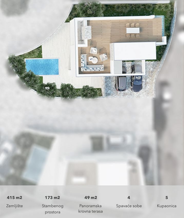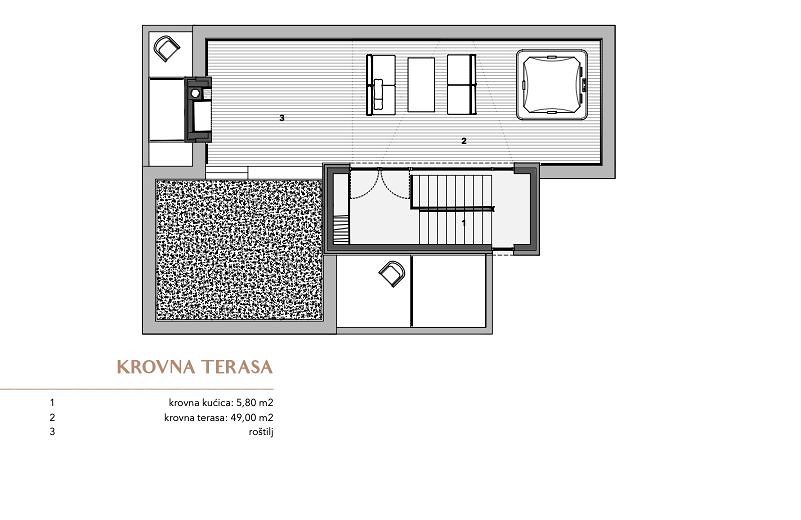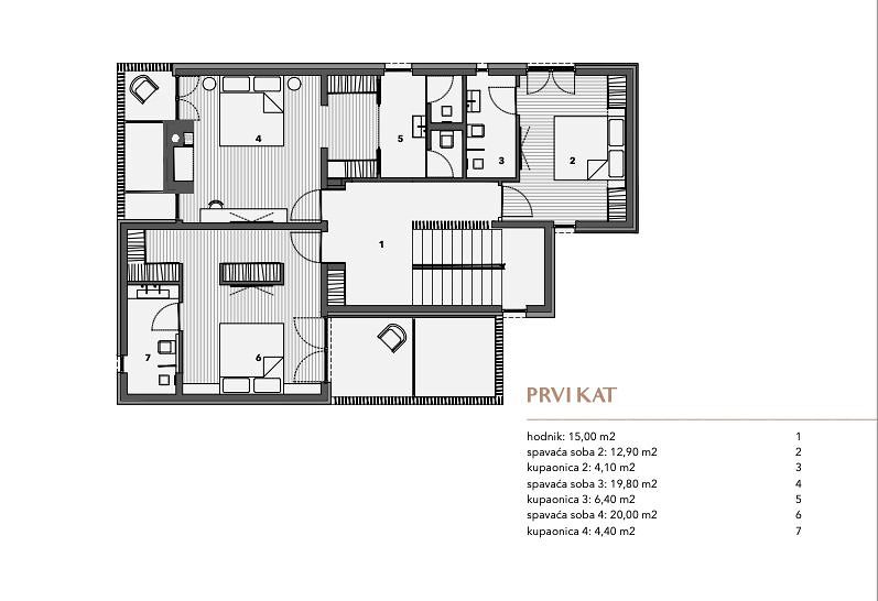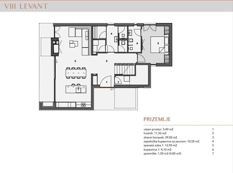 OSTROV MURTER, VĚTRNÁ RŮŽOVÁ JEZERA je nový uzavřený rezidenční komplex sestávající ze 7 rodinných domů a 1 bytového domu se 2 byty. Nachází se v jižní části obce Jezera na ostrově Murter, 45 metrů od moře (marina) a 300 metrů od dobře udržované pláže. Osada je introvertní, respektive orientovaná do vlastního vnitrozemí, aby byl zajištěn klid a intimita, ale inspirativní výhled na moře a ostrovy je nedílnou součástí každé obytné jednotky. K domům se vstupuje přes vlastní uliční náměstí, které formou a materiály připomíná tradiční urbanismus ulic a náměstí při respektování přirozené konfigurace terénu a kolem centrálního náměstí jsou domy rozmístěny v 8 směrech, inspirované růžicí kompasu, podle níž jsou domy pojmenovány. Vnitřní ulice, stejně jako vnější veřejné ulice, jsou nerovnoměrné ve vztahu k pozemkům v osadě, takže každý pozemek je vždy vyšší než silnice, kterou ohraničuje. Na křivku ulice navazují opěrné zdi, které dominují terénu a funkčně oddělují společné od soukromého. Ke každému domu náleží parkovací stání, vlastní bazén a upravená zahrada, umístění domů na pozemcích zajišťuje soukromí před pohledy sousedů, venkovní část ve stínu a prostor na opalování. Každý dům má zařízenou střešní terasu, která nabízí nejpůsobivější výhledy do okolí. Domy jsou navrženy podle vyšších standardů výstavby a bydlení. Každý dům je vybaven tepelným čerpadlem, které vytápí a chladí dům a každá místnost je vytápěna a chlazena, kromě skladu. Všechny koupelny a kuchyně jsou vybaveny elektrickým podlahovým vytápěním. Prosklené stěny a okna jsou vyrobeny z vysoce kvalitních hliníkových profilů s nízkými faktory tepelné a zvukové vodivosti. Všechny otvory a zasklení jsou vybaveny ovladatelnou protisluneční ochranou. Vytápění a chlazení, ochranu proti slunci a video dohled lze ovládat pomocí chytrého telefonu ze vzdáleného místa. Každá bytová jednotka bude plně vybavena nábytkem, který bude viditelný v následně vytvořeném designu interiéru. Vybavení koupelen, instalační technika, podlahové a stěnové krytiny jsou produkty renomovaných světových výrobců. Venkovní areál zdobí oplocení, místní rostliny nebo kamenné oblázky a venkovní bazén je vyhřívaný. LEVANT je osmý dům v osadě Wind Rose a nachází se ve východní části. Dům obsahuje 4 ložnice a 5 koupelen. Jedna ložnice se nachází v přízemí a je přístupná pro osoby s omezenou schopností pohybu nebo může být použita jako kancelář/posilovna. Na rodinný pokoj navazuje krytá terasa a zahrada, kde je i bazén. Je orientován do nitra osady, aby byl zajištěn klid a soukromí, od domů 2 a 3 je stíněný vysokou a nízkou zelení. Na střeše je panoramatická terasa s nerušeným výhledem na moře, přístav a ostrov a střešní dům je umístěn tak, aby omezoval výhledy ze sousedních střešních teras. Protisluneční ochranu zajišťuje tvar domu, konkrétně konzolový výstupek, pevné lamely, které jsou vedle tradičního kamene rozpoznatelným motivem sídliště, a elektricky pohyblivé žaluzie. Na pozemku je parkoviště pro dvě vozidla a přívěs pro malou loď. PŘÍZEMÍ vstupní plocha: 3,40 m2 chodba: 11,50 m2 obývací pokoj: 39,00 m2 společná koupelna se saunou: 10,50 m2 ložnice 1: 12,90 m2 koupelna 1: 4,10 m2 komora: 1,50 m2 (FLO2) FST2 chodba: m25 FST 00 chodba: m25 FST. 12,90 m2 koupelna 2: 4,10 m2 ložnice 3: 19,80 m2 koupelna 3: 6,40 m2 ložnice 4: 20,00 m2 koupelna 4: 4,40 m2, střešní domeček: 5,80 m2, střešní terasa: 29,00