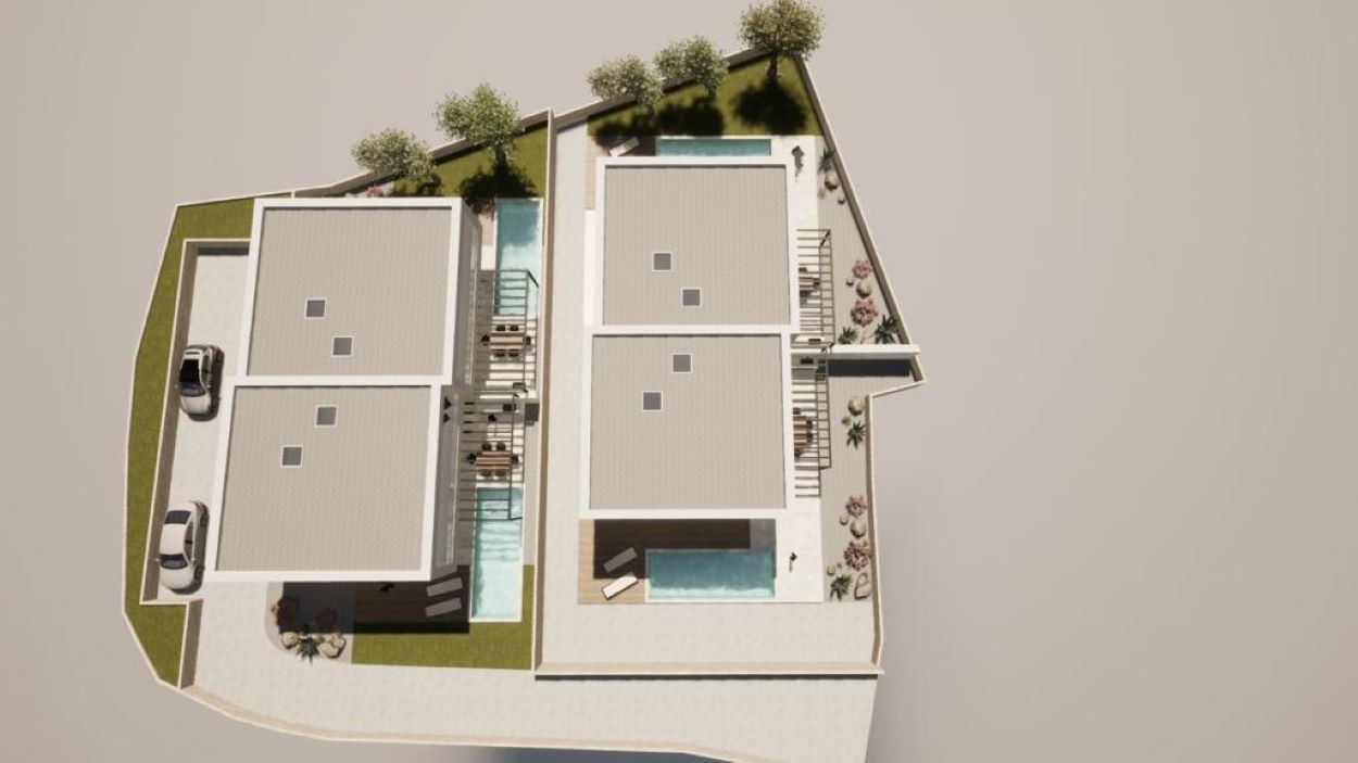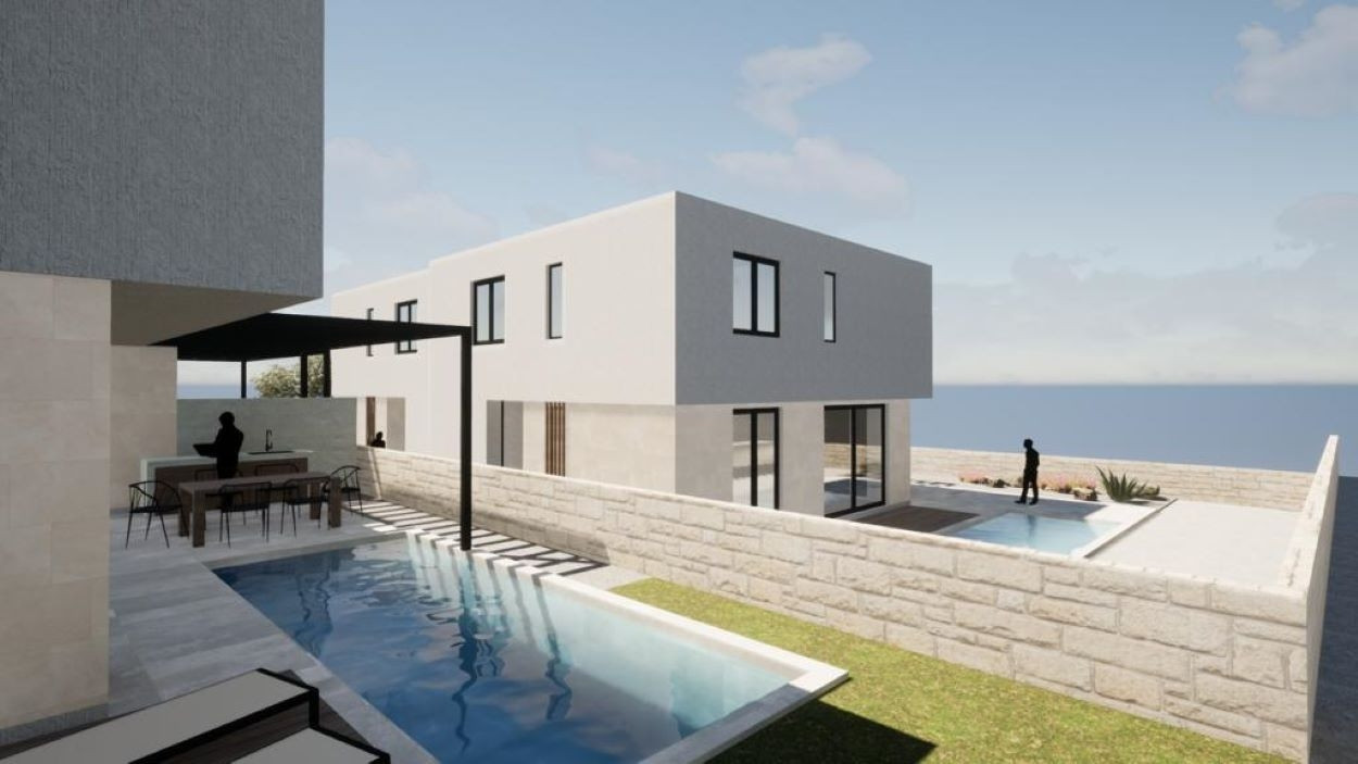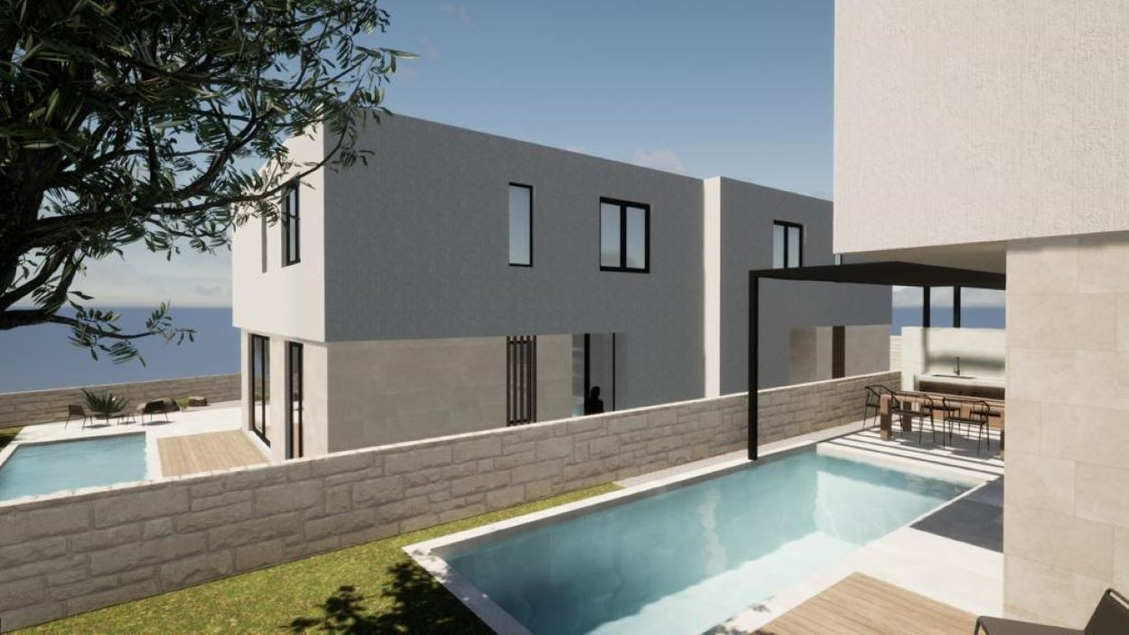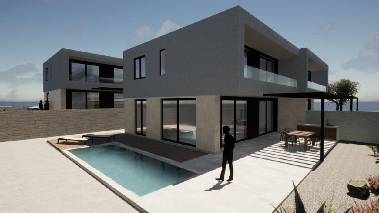 Nabízíme k prodeji luxusní dvojvily s bazény v Bibinje, které leží na pobřeží Jaderského moře, několik kilometrů jižně od Zadaru. Každá vila má podlahovou plochu 181m2, nachází se na pozemku o rozloze 350m2 a skládá se z: