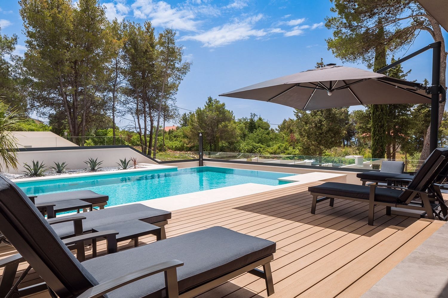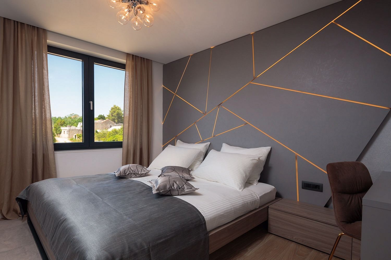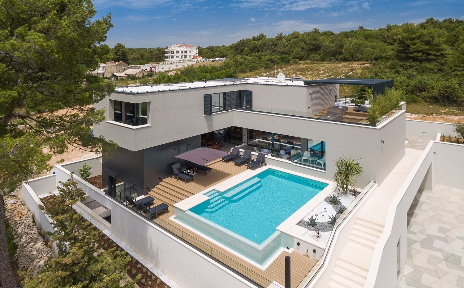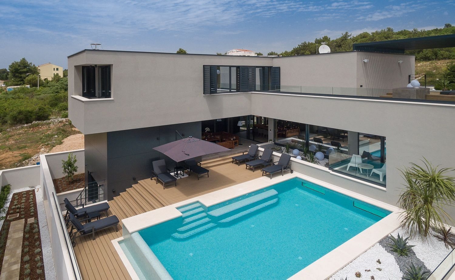Exkluzivní luxusní vila s bazénem v Diklo - perfektní příležitost pro vaši oázu pohodlí Tato impozantní vila postavená v roce 2018 představuje skutečnou oázu luxusu a pohodlí. Tato vila o celkové ploše 453 m2 pojme až 10 osob a nachází se na impozantním pozemku o rozloze 1209 m2. Uvnitř vily na vás čeká pět prostorných ložnic, z nichž každá je vybavena šatnou, chytrou televizí a špičkovými reproduktory pro dokonalý zážitek ze zábavy. Se třemi samostatnými toaletami a pěti vlastními koupelnami, z nichž dvě jsou s vanou, zatímco ostatní nabízejí moderně řešené sprchové kouty, je vaše soukromí a pohodlí zaručeno. Kuchyně vily je plně vybavená a propojená s prostornou jídelnou pro 10 osob, což vytváří dokonalé prostředí pro socializaci a stravování. Jídelna také navazuje na tavernu, kde se pohodlně vejde dalších 10 hostů. V elegantně zařízeném obývacím pokoji s Hi-Fi systémem a chytrou televizí si můžete naplno užít dovolenou s přáteli nebo rodinou. Pro ty, kteří pracují mimo kancelář, je k dispozici také vyhrazená studovna, která nabízí klidné prostředí pro produktivní práci. Kromě toho tato vila nabízí vynikající zařízení včetně posilovny, sauny a vířivky pro další relaxaci a rozmazlování. Ve dvoře je krásný bazén o velikosti 48 m2 vybavený vyhřívacími a ochlazovacími tryskami. Vila je celá obehnána zdí a poskytuje naprosté soukromí a bezpečí. Nachází se v turisticky přívětivé a dobře dostupné části města Diklo, jen pár kilometrů od historického centra města Zadaru, zatímco krásné oblázkové pláže vzdálené pouhý 1 kilometr dělají z této lokality ideální místo pro odpočinkovou dovolenou.
