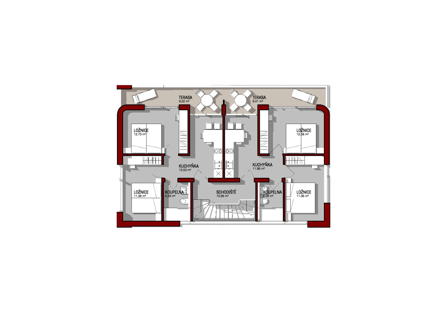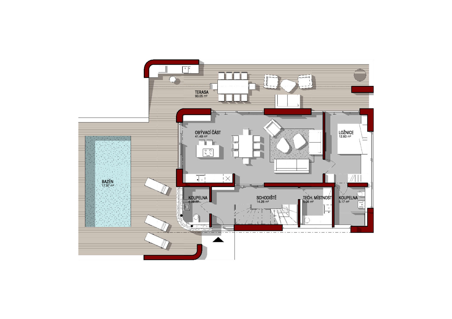 Přízemí se skládá z prostorného obývacího pokoje s kuchyní a jídelním koutem, ložnice, dvou koupelen, technické místnosti a schodiště. Z obývacího pokoje je přímý přístup na venkovní terasu o velikosti 93 m² a k venkovnímu bazénu o rozloze 17 m². V prvním patře se nacházejí dva apartmány, z nichž každý má kuchyň s jídelním koutem, dvě ložnice, koupelnu a venkovní terasu o velikosti 9 m².