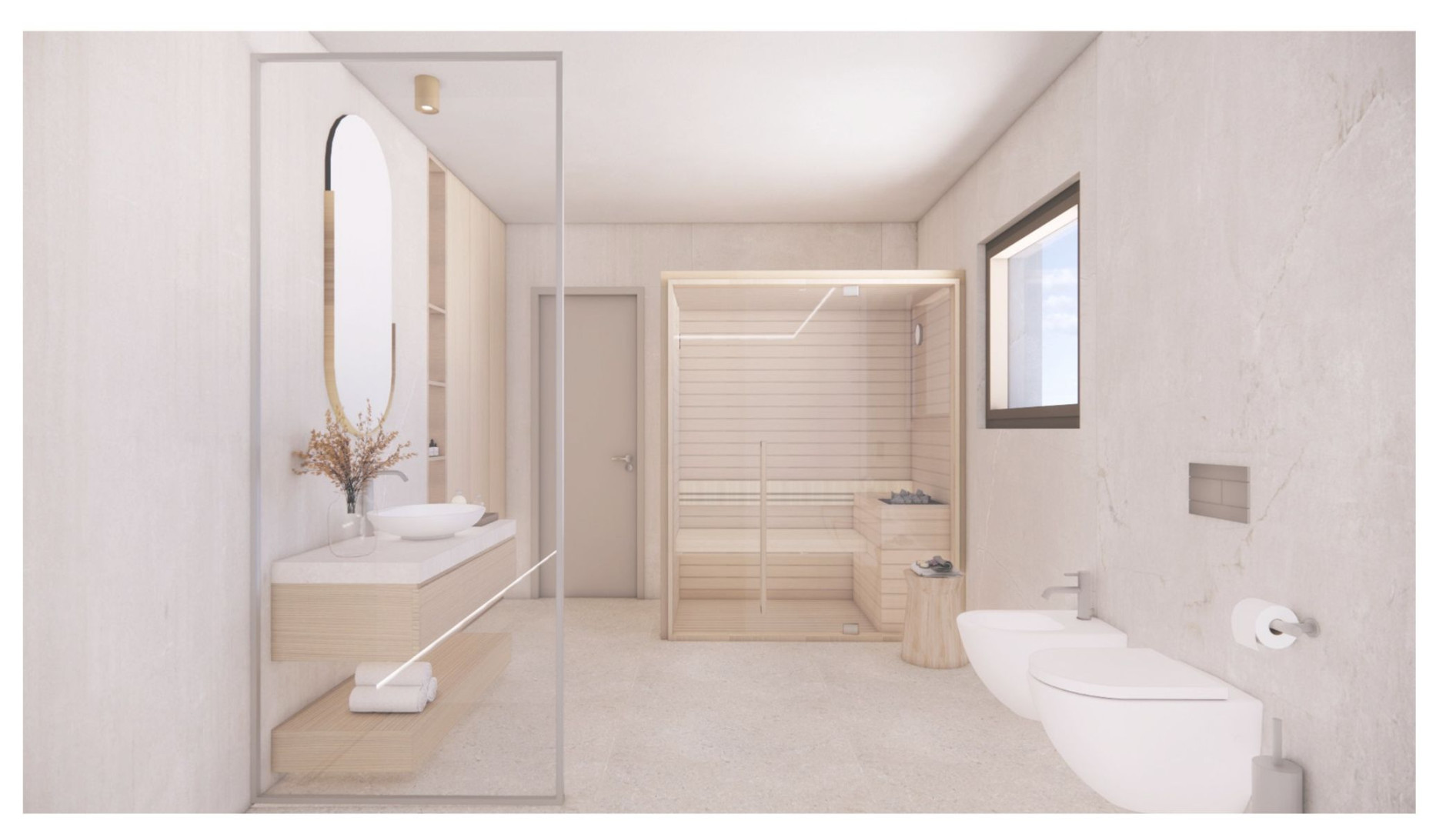 Chodba, hlavní ložnice s koupelnou a saunou, druhá ložnice s koupelnou, prostorná zastřešená terasa s výhledem na moře.
