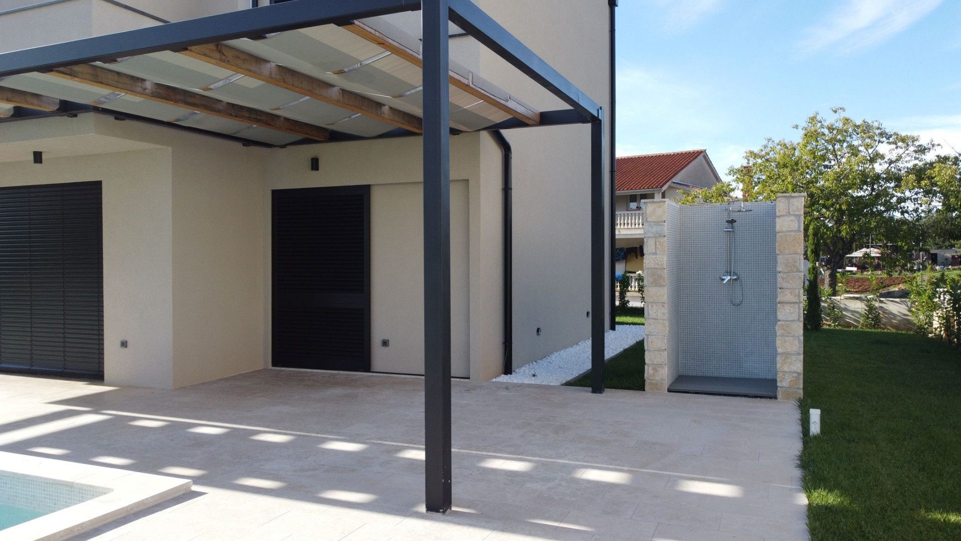 - Bazén 47 m², sluneční terasa, částečně zastřešená terasa, 2 parkovací místa, upravené zelené plochy.