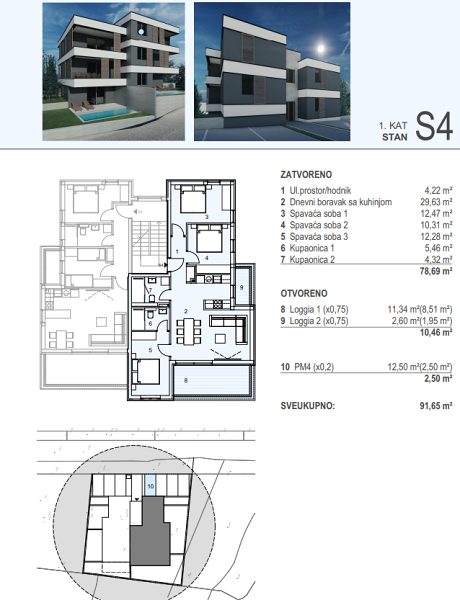 Byt se nachází v prvním patře domu, který má celkem šest bytů. Součástí bytu jsou dvě lodžie, jedna o rozloze 11.34 m2 a druhá 2,60m2. Samozřejmostí je parkovací stání o výměře 12,50 m2. Velmi atraktivní poloha domu je vzdálená cca 120m od moře a 300m od krásné pláže. Pláž obce Šimuni patří k deseti nejlepším plážím na Jadranu, která je charakteristická svým přírodním stínem. Byt je možné využít k trvalému bydlení, jako investici k pronájmu nebo k letní dovolené. Moderní stavba využívá nejnovějších technologií jako termo izolaci, plastová okna i dveře s tříkomorovým systémem, elektrickými venkovními roletami, sítě proti hmyzu. Energetická kategorie A garantuje příjemné teploty po dobu celého roku. Samozřejmostí je klimatizace. Součástí je i komín a prostor umožňující montáž krbových kamen.